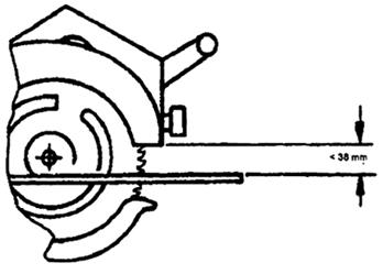 a) bên dưới tấm dẫn hướng, khoảng cách hướng tâm giữa dao tách mạch và mép lưỡi cưa tại điểm bất kỳ không được vượt quá 5 mm ở độ sâu cắt đã đặt.