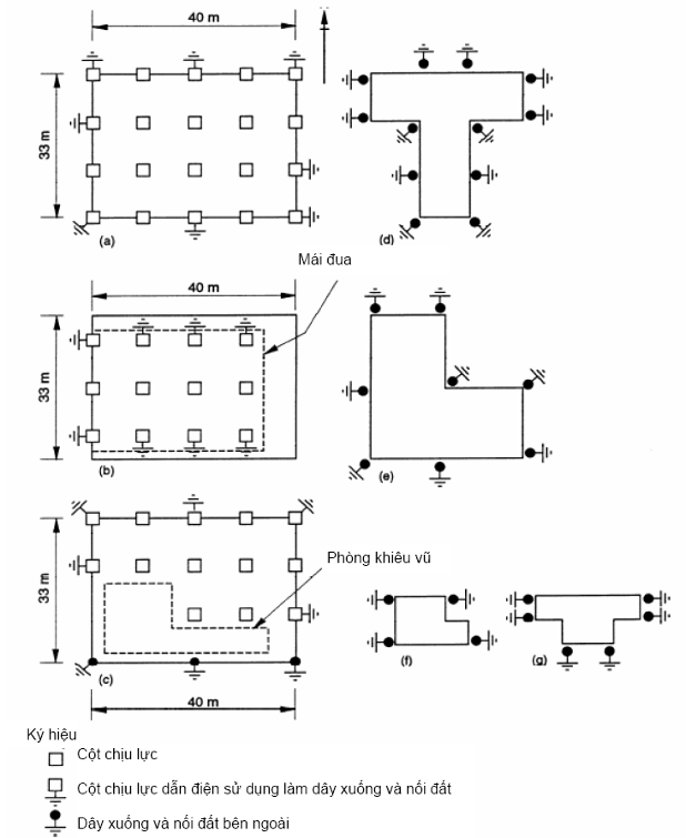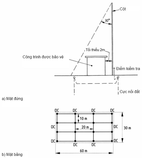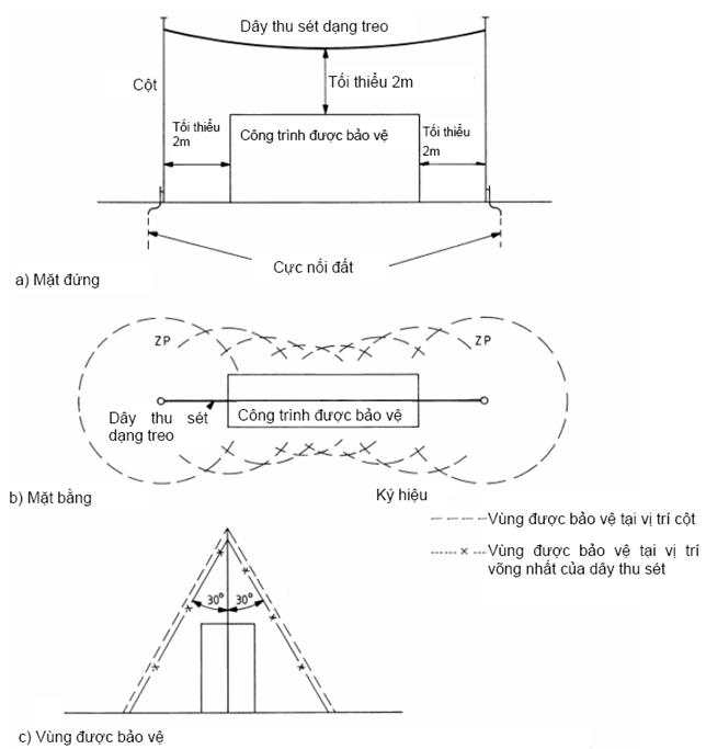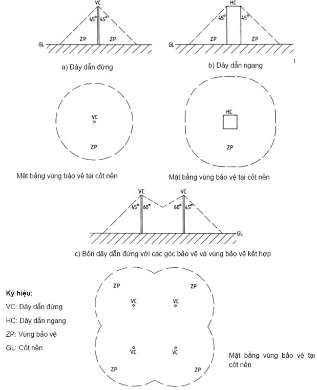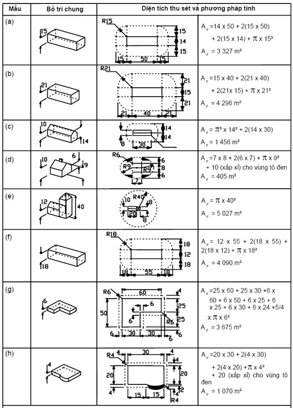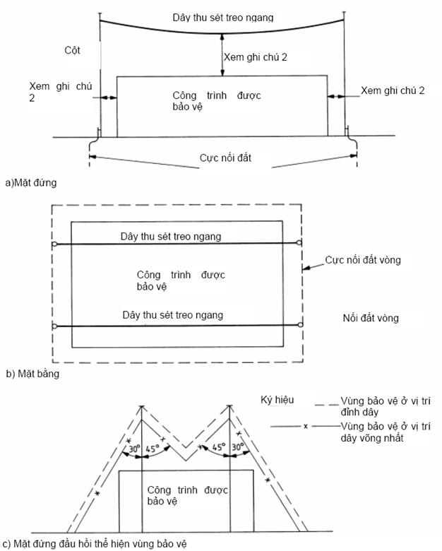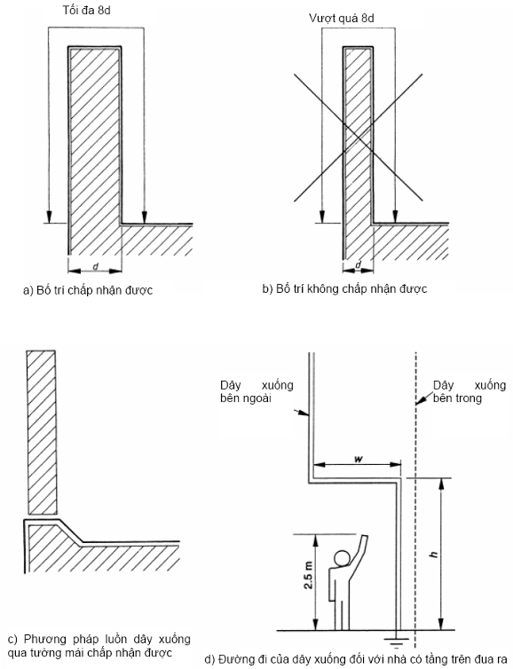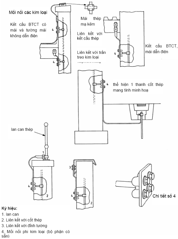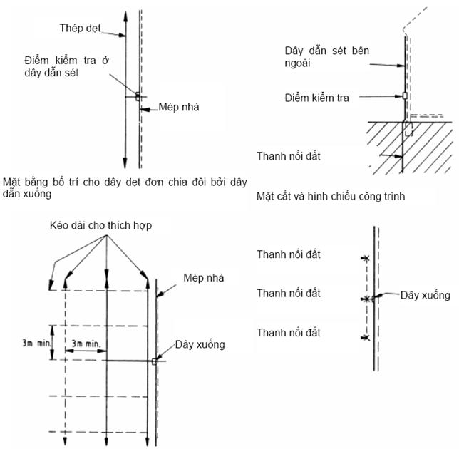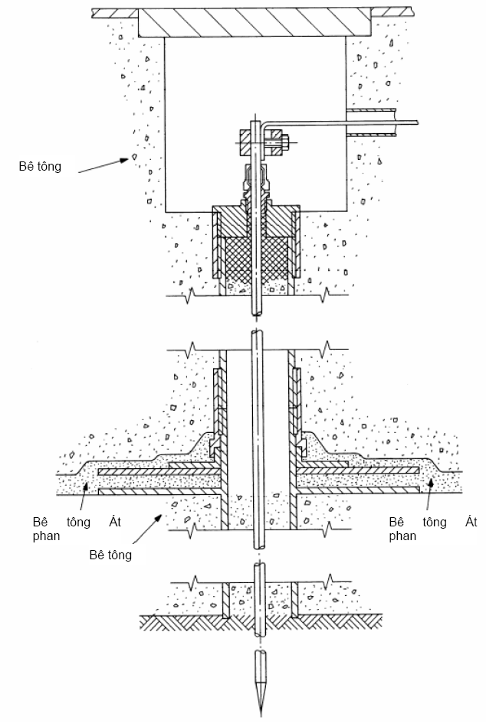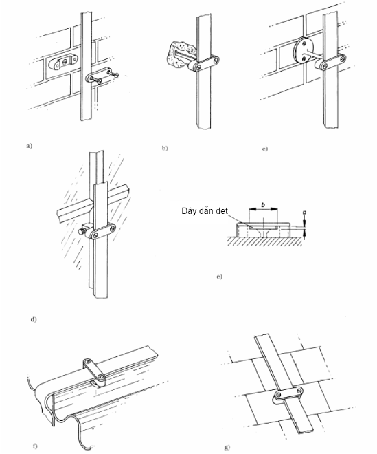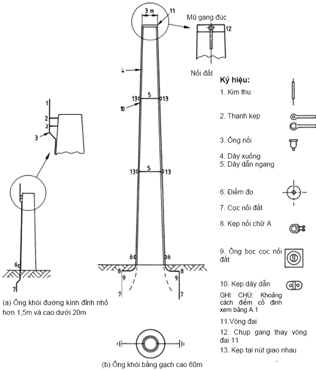 a Sai số cho phép: - 3 %. b Nhúng nóng hoặc phủ điện, chiều dày lớp phủ tối thiểu là 1 micron. c Lớp phủ phải nhẵn, liên tục và không có vết sần với chiều dày danh định là 50 microns. d Chromium 16 %; Nickel 8 %; Carbon 0,07 %. e 50 mm² (đường kính 8 mm) có thể giảm xuống 28 mm² (đường kính 6 mm) trong một số trường hợp không yêu cầu sức bền cơ học cao. Trong trường hợp đó cần lưu ý giảm khoảng cách giữa các điểm cố định. f Chỉ áp dụng cho kim thu sét. Trường hợp ứng suất phát sinh do tải trọng như gió gây ra không lớn thì có thể sử dụng kim thu sét dài tối đa tới 1m đường kính 10mm g Chỉ áp dụng cho thanh cắm xuống đất. h Nếu phải quan tâm đặc biệt tới vấn đề cơ và nhiệt thì các giá trị trên cần tăng lên 78 mm² (đường kính 10 mm) đối với dây tròn đặc và 75 mm² (dày tối thiểu 3 mm) đối với thanh dẹt đặc. |